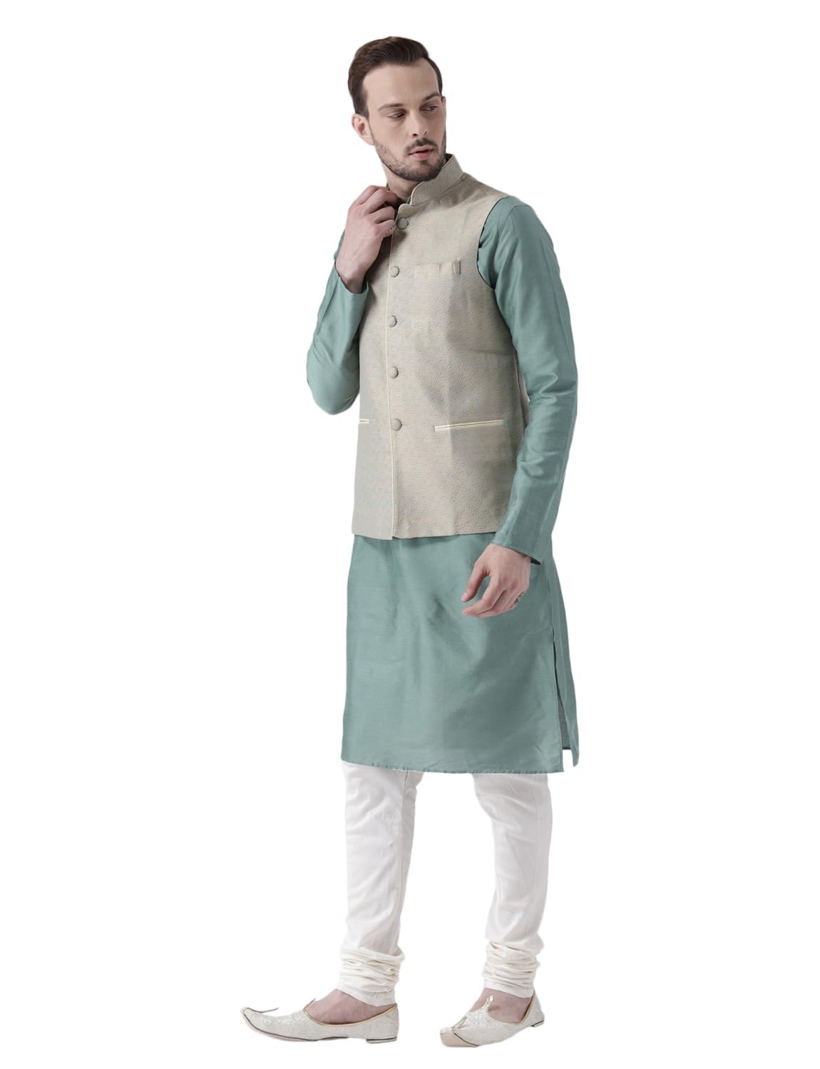 - ELEGANT LAYERED DESIGN – The jacquard kurta with Mandarin collar is paired with a coordinated churidar and a stylish waistcoat for men, giving a sharp, regal look suitable for weddings and festivals.